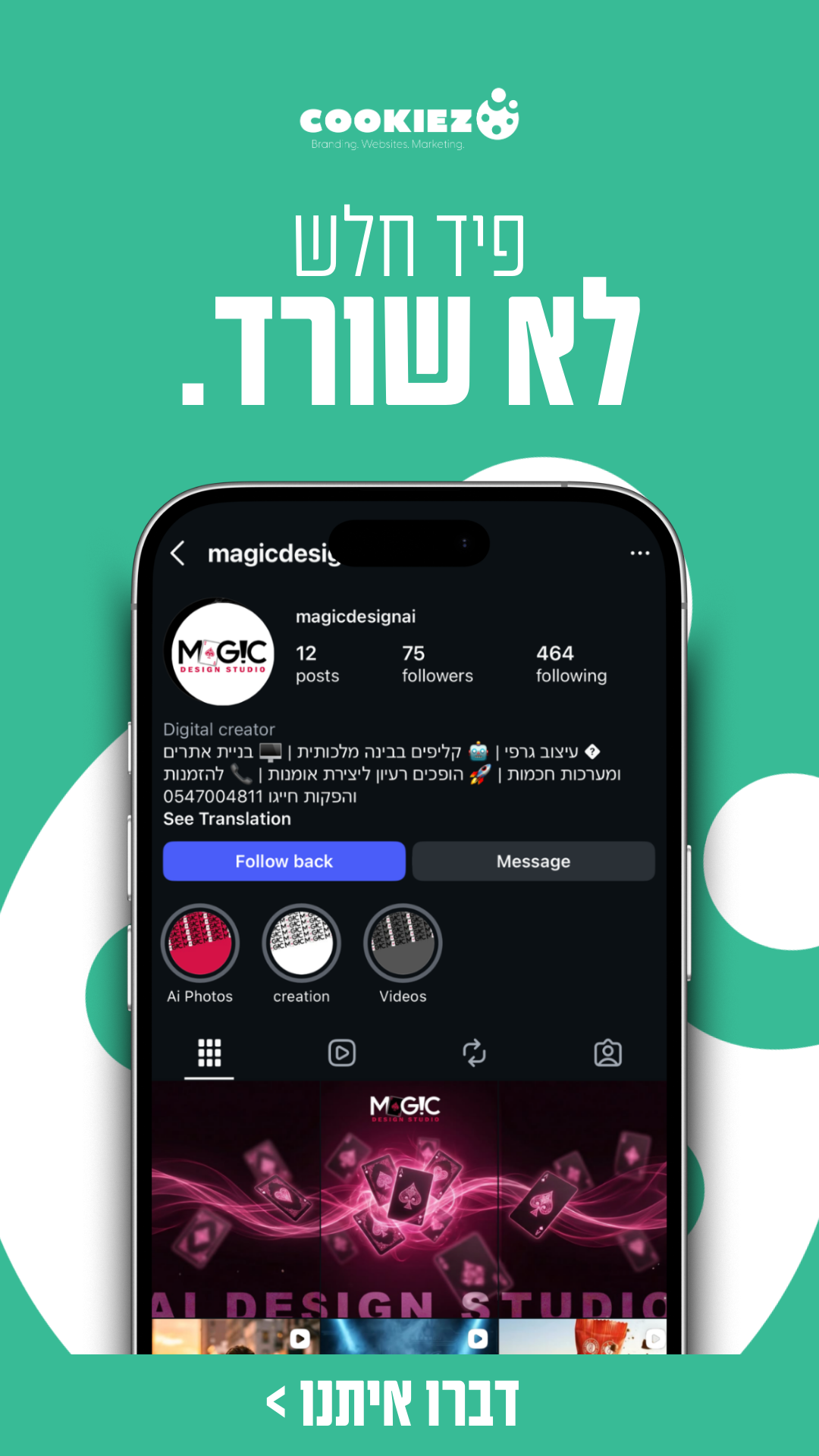 אנחנו מאמינים שקריאייטיב חכם, אסטרטגיה מדויקת ושפה עיצובית נכונה יכולים להפוך עסק למותג שאי אפשר להתעלם ממנו.